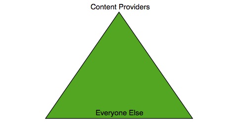We might visualize the distributive mechanism of these media as a pyramid, with the owners and content creators at the top and everyone else on the bottom, receiving what they made: