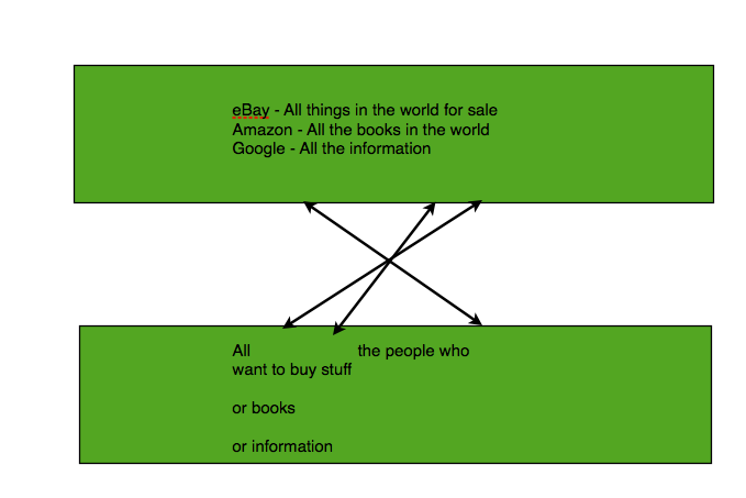 In the new architecture, unlimited content, mostly provided by the users themselves, sought out unlimited users globally. This is the model that eBay uses, and Amazon.com and Google. Everything in the world being offered all the time. Everyone in the world gaining access. The company placed itself at the nexus of this transaction.